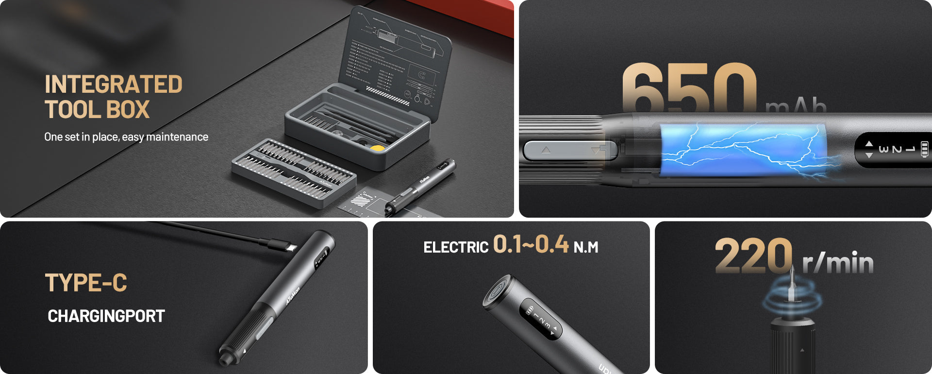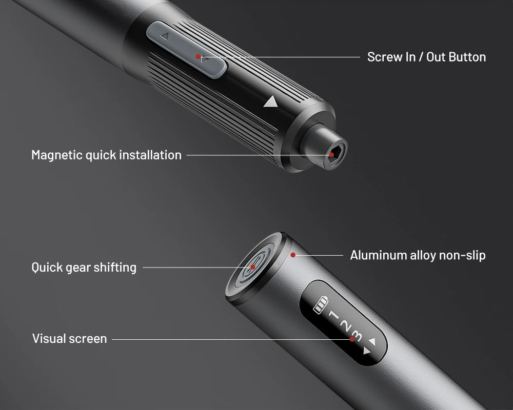 The screwdriver has3 torque settings (1–4 kgf·cm)and reaches up to230 rpm, allowing both delicate and stronger screw work.