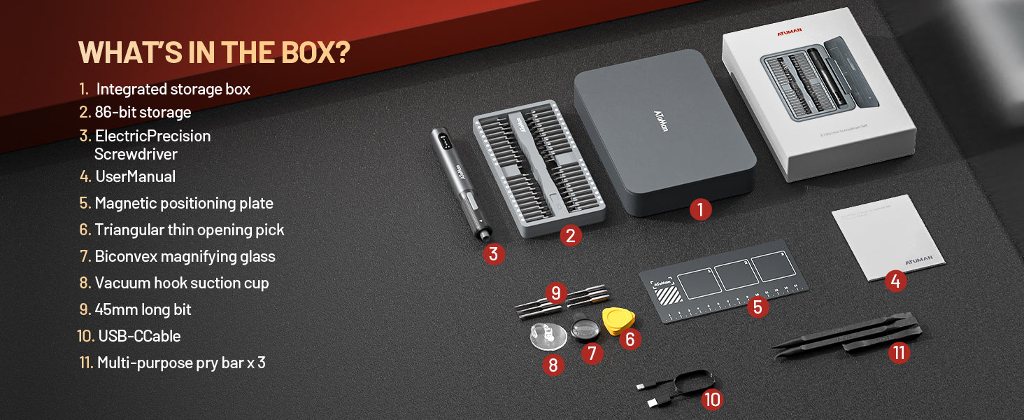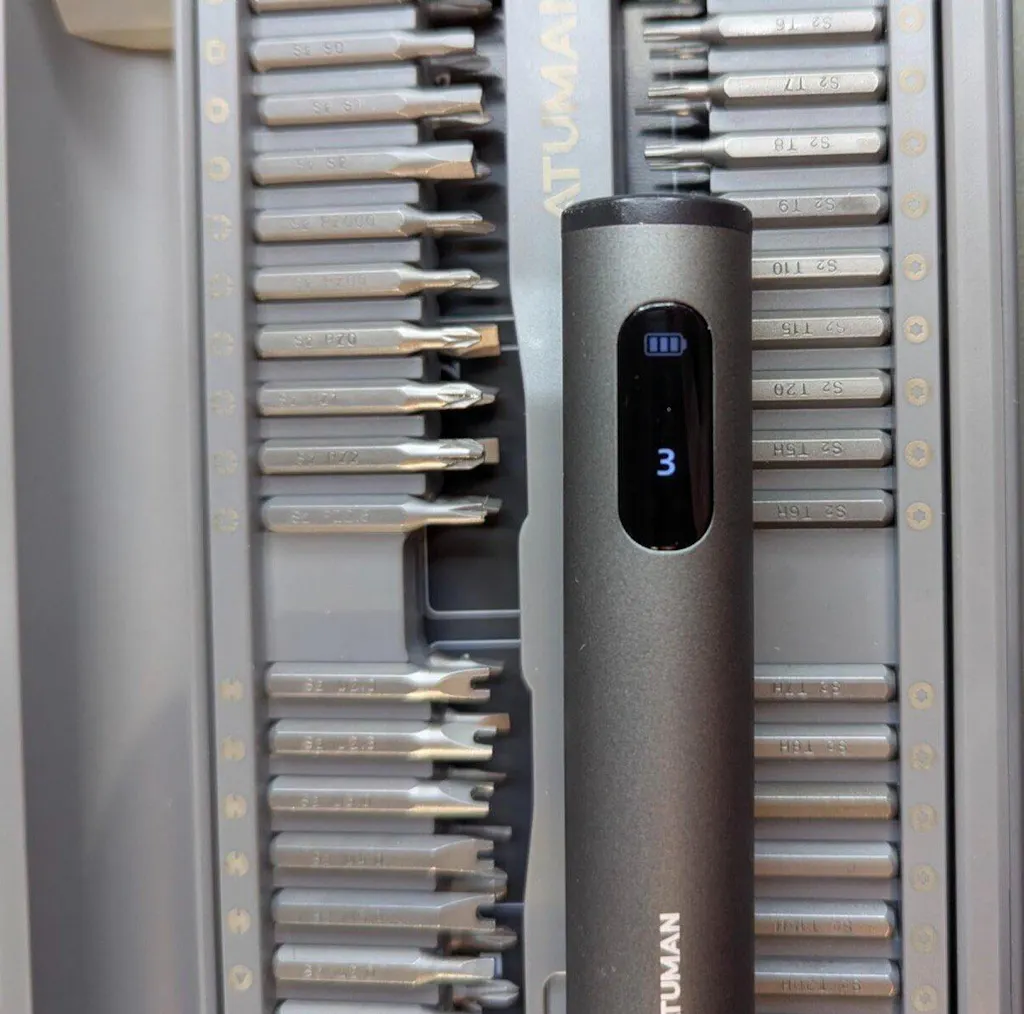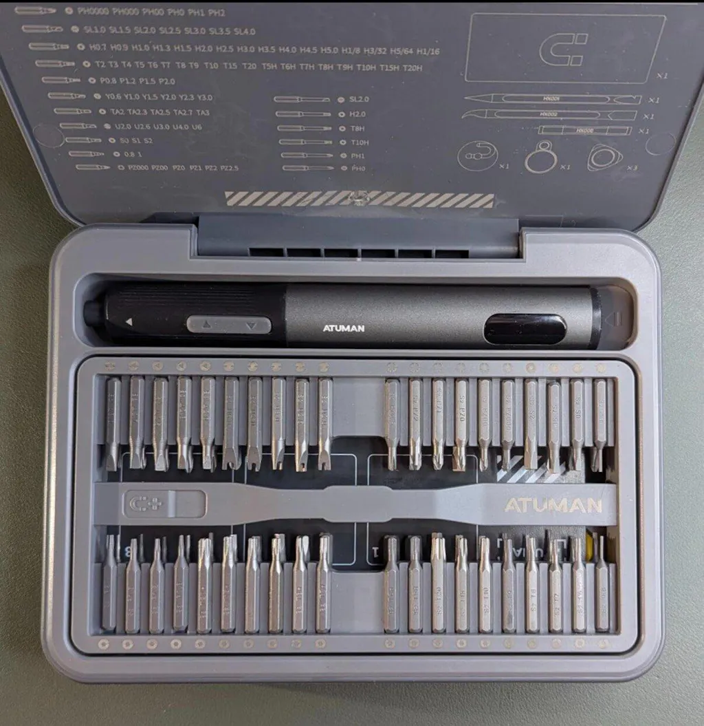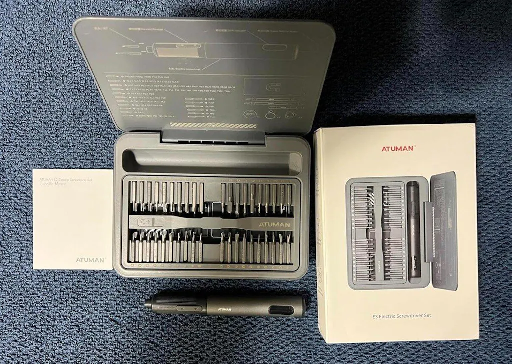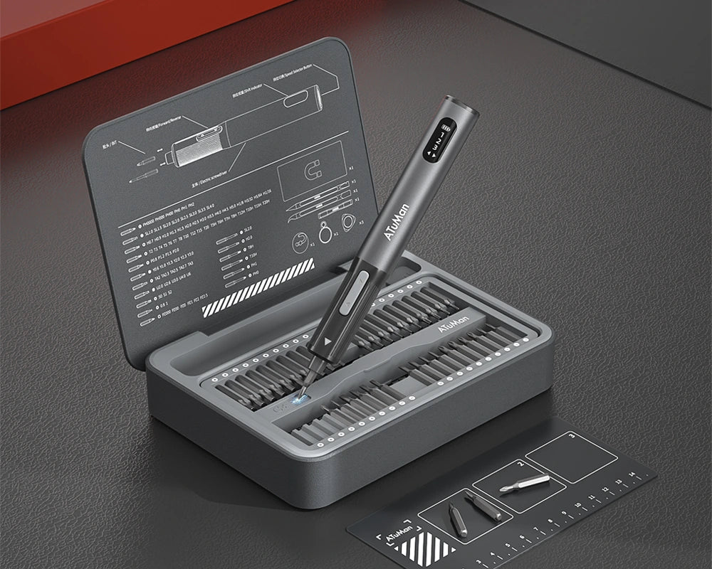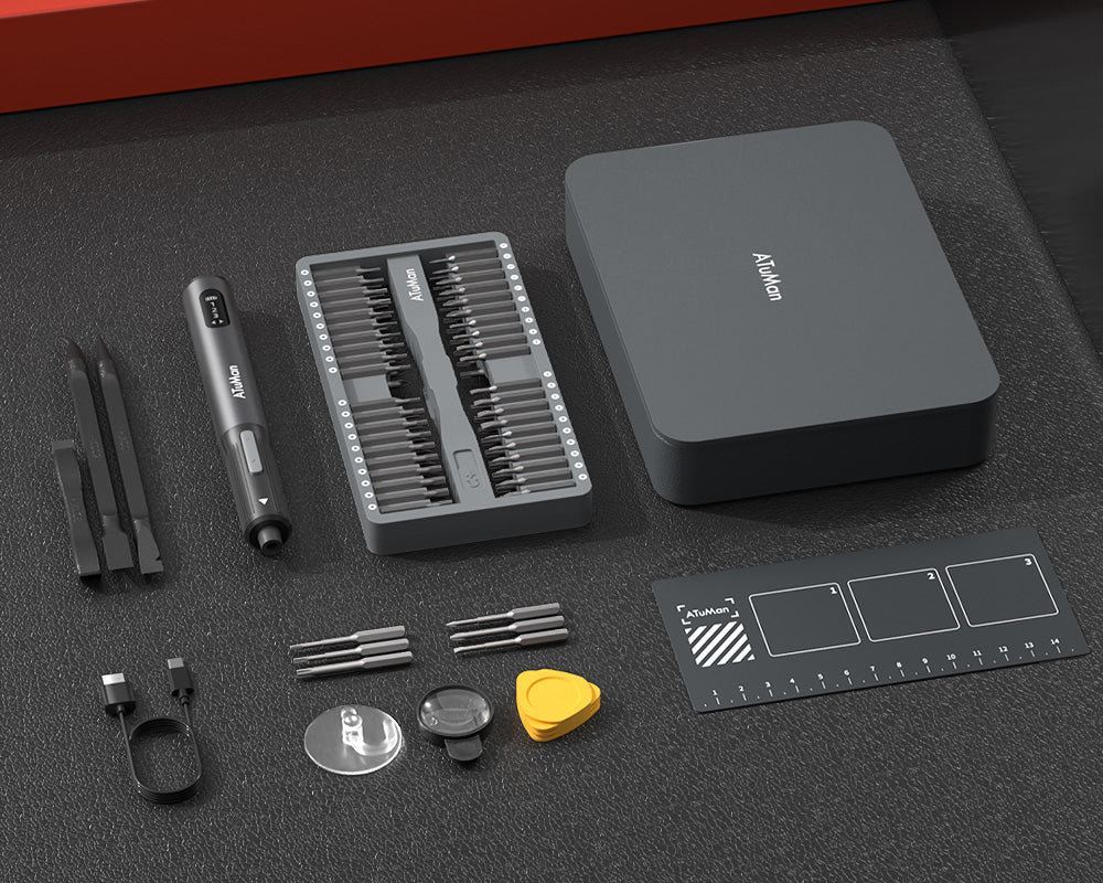 The ATuMan E3 Electric Screwdriver Set is a compact, all-in-one repair kit perfect for electronics, gadgets, and home essentials. Featuring high torque and 3-level adjustable settings, it handles delicate electronics and tougher household repairs with ease. The integrated toolbox keeps 95 precision accessories organized, while the smart display and magnetic work plate ensure convenient, efficient, and loss-free operation. Rechargeable via Type-C, it’s portable and ready for any DIY or professional task.