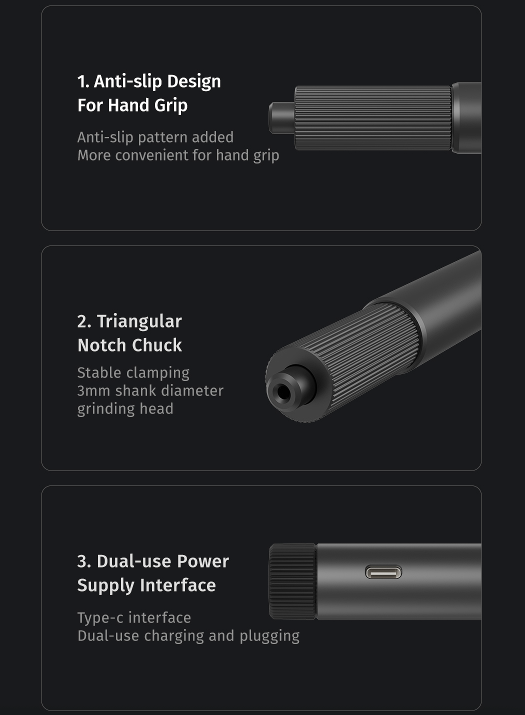 Innovative high-precision three-jaw structure chuck,suitable for main stream 3mm shank diameter grinding head, automatic locking design when rotating, to ensure more stable and efficient grinding, and achieve stunning work.