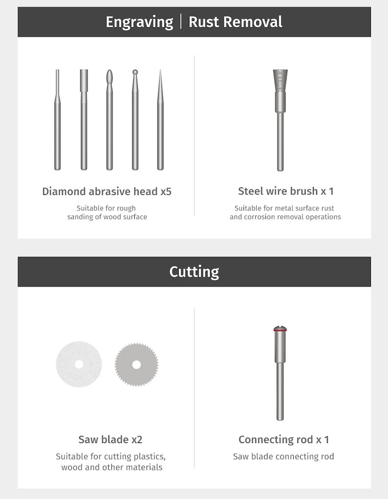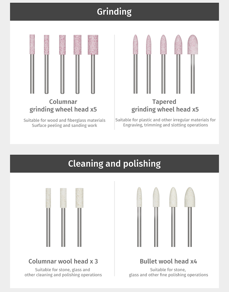 Ideal for engraving, grinding, polishing, sanding, drilling, and cutting across wood, metal, glass, plastic, and more. -